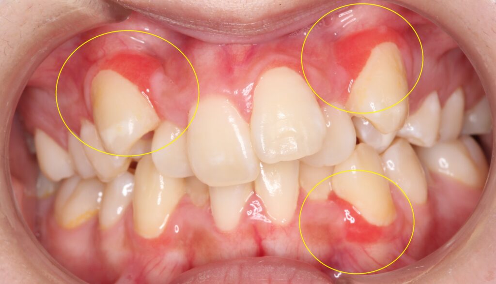 歯の矯正中でも、装置の周りの汚れが赤くなっている方がいますが、